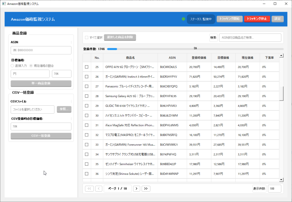 「ランキング」「価格範囲」「新品出品者数」「価格下落率」などこちらで設定した条件に一致する商品を1分単位で取得し通知するシステムです。