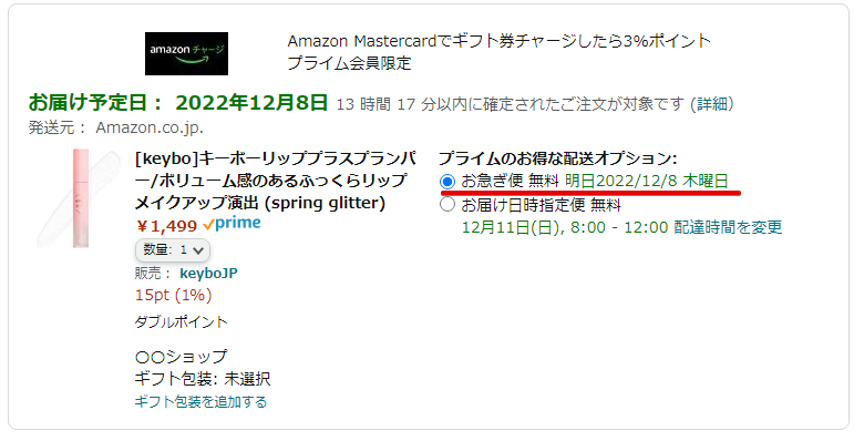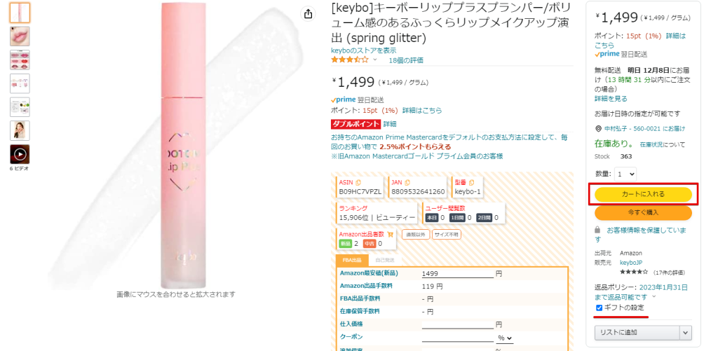 Amazonの商品ページを開いたら「ギフト設定」にチェックを付けてカートに入れます。