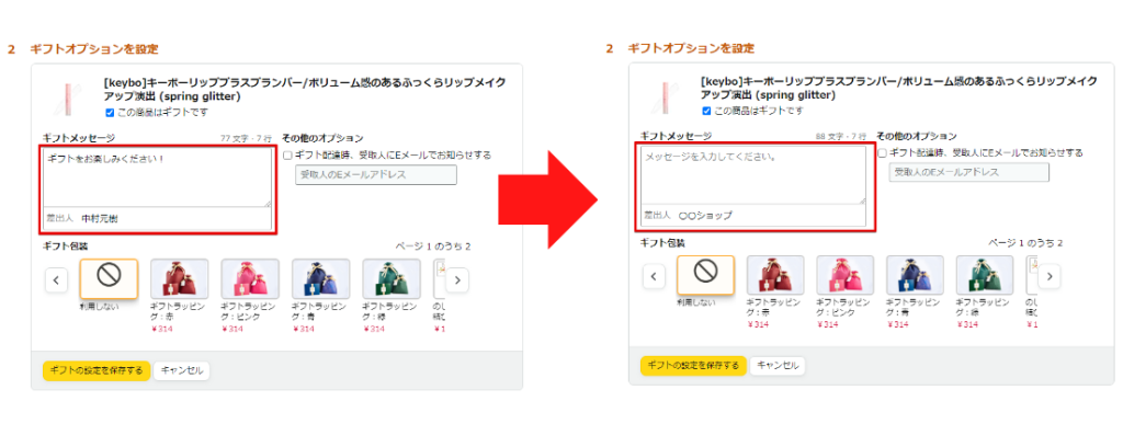 デフォルトでギフトメッセージと差出人が記入されているので、ギフトメッセージを空白、差出人をショップ名に変更しましょう。