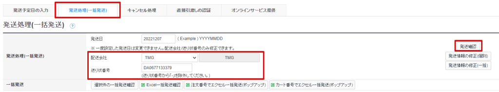 商品注文者の「発送処理」タブを開き、配送会社を選択し送り状番号を入力し、「発送確認」をクリックします。