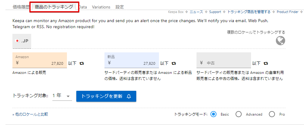 ではどのように設定していくかというと、まずKeepaのグラフの上には「価格履歴」「商品のトラッキング」「Data」「Variations」「設定」というタブがあります。