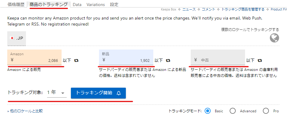 「商品のトラッキング」タブを選択し、「Amazon」「新品」「中古」にトラッキングしたい金額(この金額になったら通知してほしいという金額)を入力し、それをどれくらいの期間続けるかを「トラッキング対象」で決定し、「トラッキング開始」をクリックします。