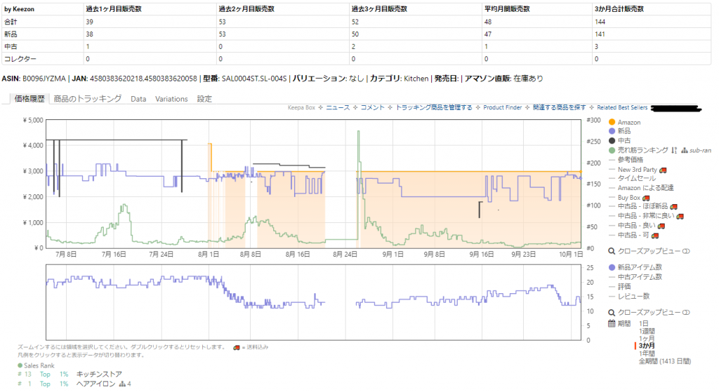 キーゾンを導入すると、先ほどのKeepaのグラフの上に購入回数は表示されます。