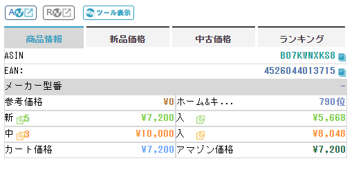 表のタブ「商品情報」「新品価格」「中古価格」「ランキング」をクリックすることで、それぞれの情報に切り替わります。