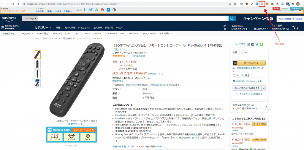 Amazonなどの商品ページで先ほど確認した価格比較PRICLEのアイコンをクリックします。