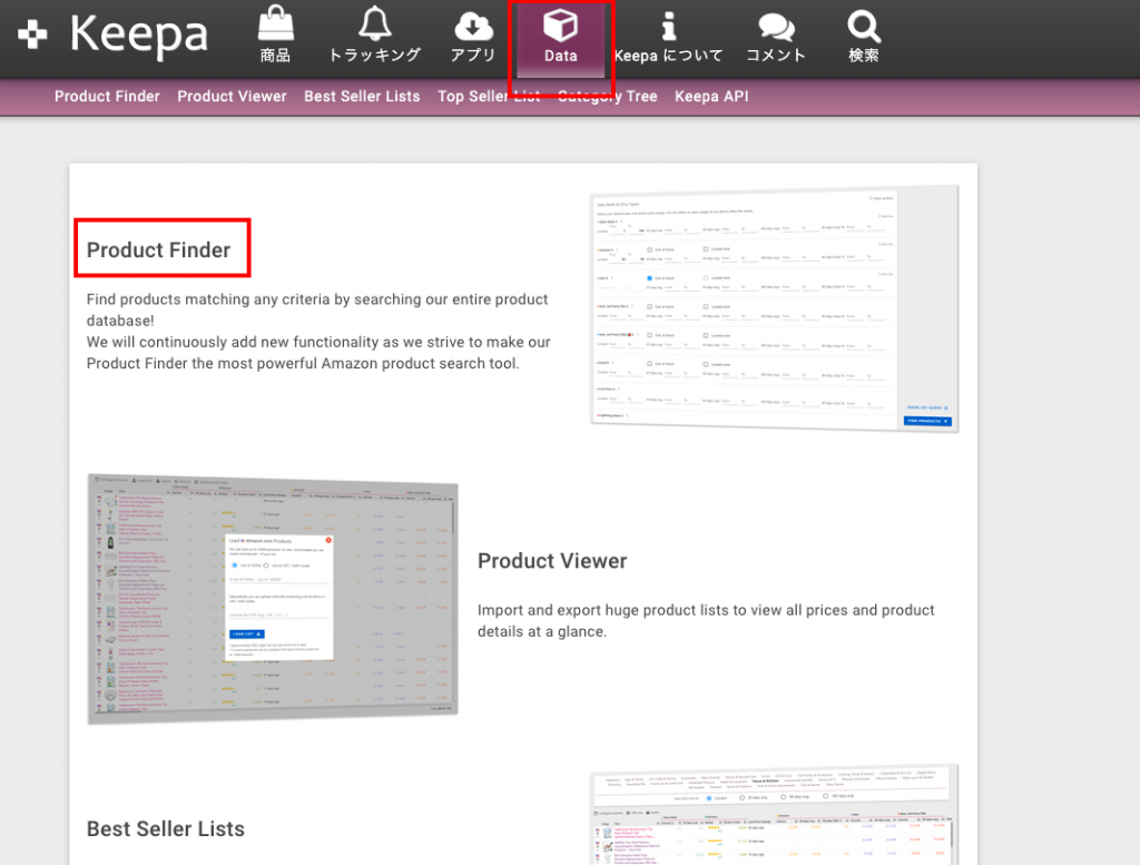 Keepaを開き、「Data」をクリックし、「Product Finder」をクリックします。