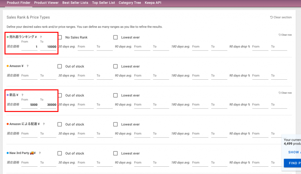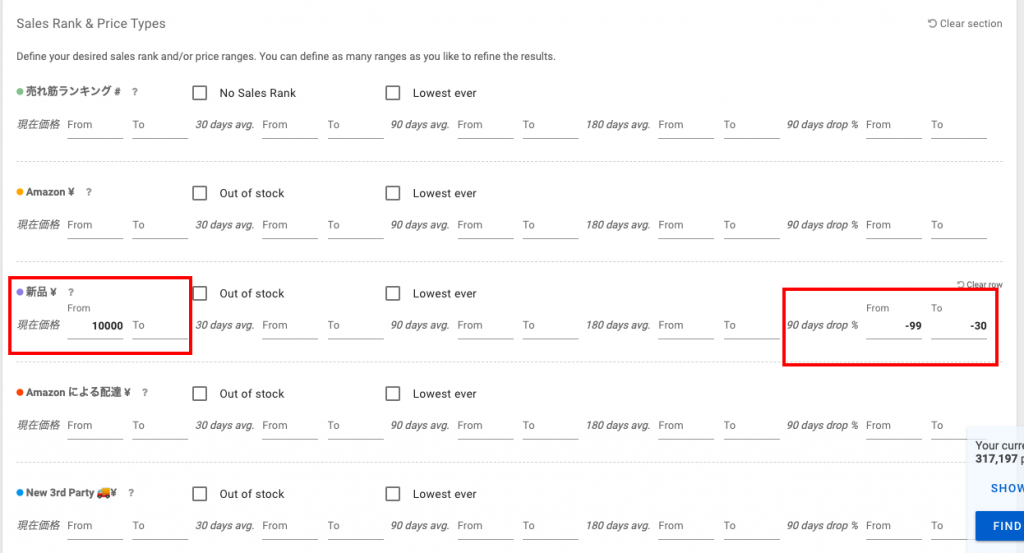 今回は新品価格を「10000円」、「90 days drop %」を「-99 ~ -30」としています。