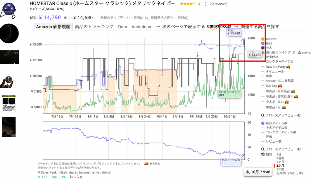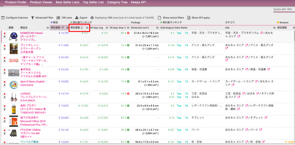 Keepaで現在値段が上がっている商品を探していきます。