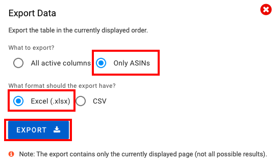「5000rows」に設定し、「Export」からASINのみで商品のASINを出力します。