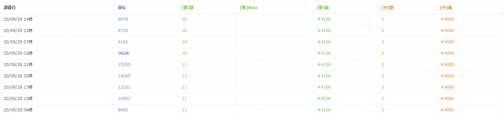 今回の場合、20/09/29 21時の中古出品者は2人、20/09/29 03時の中古出品者も2人なので、