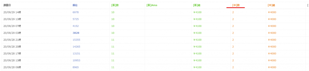 表では「[中]数」と書かれているのが中古の出品者数のことです。
