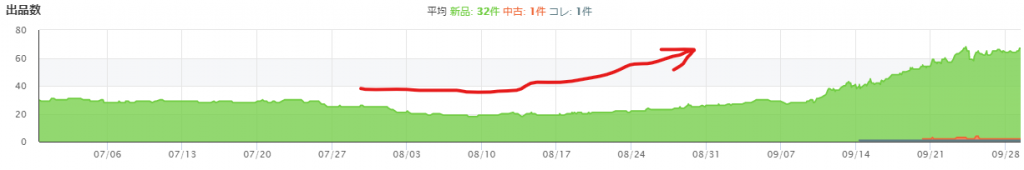下のグラフのように徐々に出品者数が増えている商品は要注意です。
