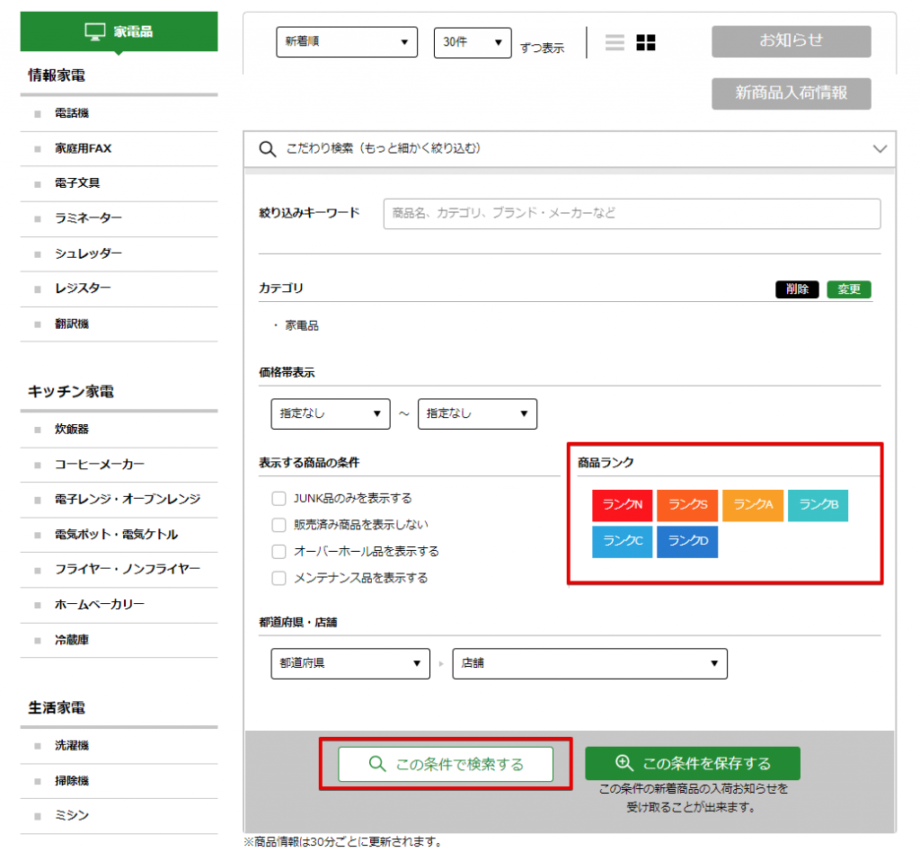 今回は新品のみリサーチするため、商品ランクを「ランクN」「ランクS」のみ選択します。