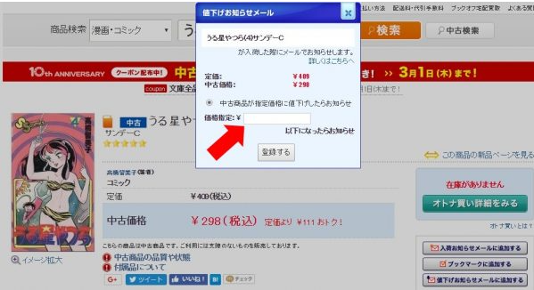 ※先に「入荷お知らせメールに追加する」をクリックしている場合、「値下げお知らせメールを追加する」をクリックすると「すでに設定済みです!」とポップアップが出てしまいます。「入荷お知らせメール」に追加済みの商品は、マイブックオフの「お知らせメールを設定する」から価格を設定してください。