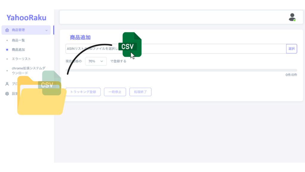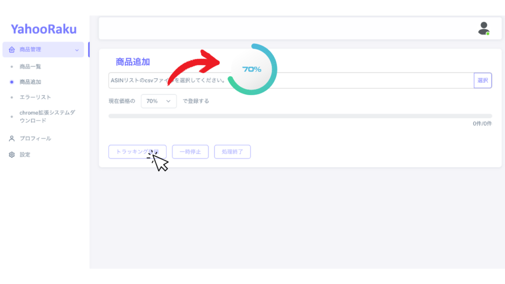 ASINリストを読み込み、一括で目標価格を設定しトラッキング登録します。目標価格はAmazonの現在価格を基に設定されます。